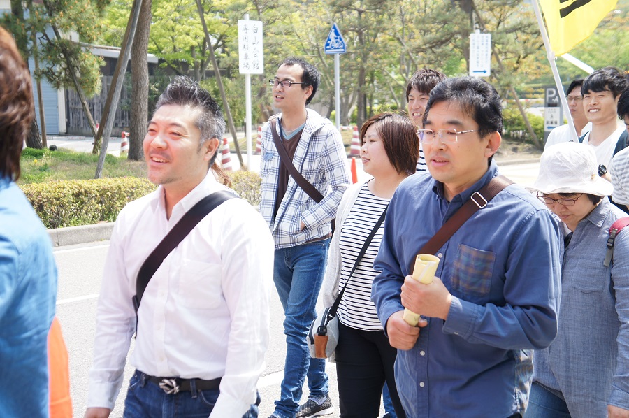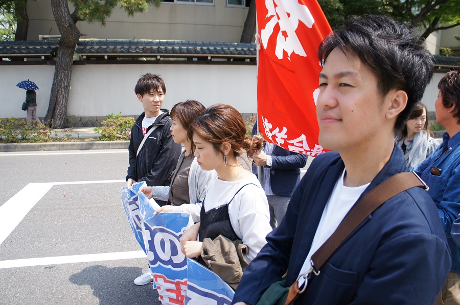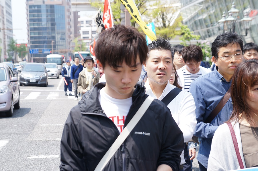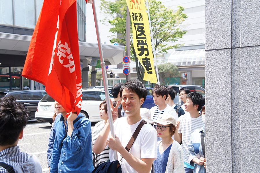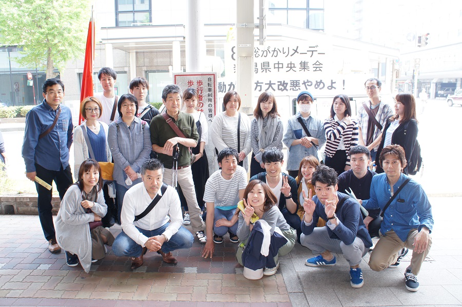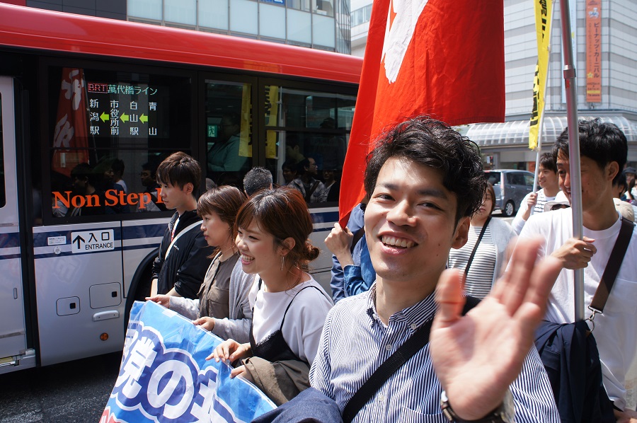 県民会館にて決起集会が行われ、その後デモ行進を行いました。(新潟県民会館→東中通り→柾谷小路→郵便局前まで)