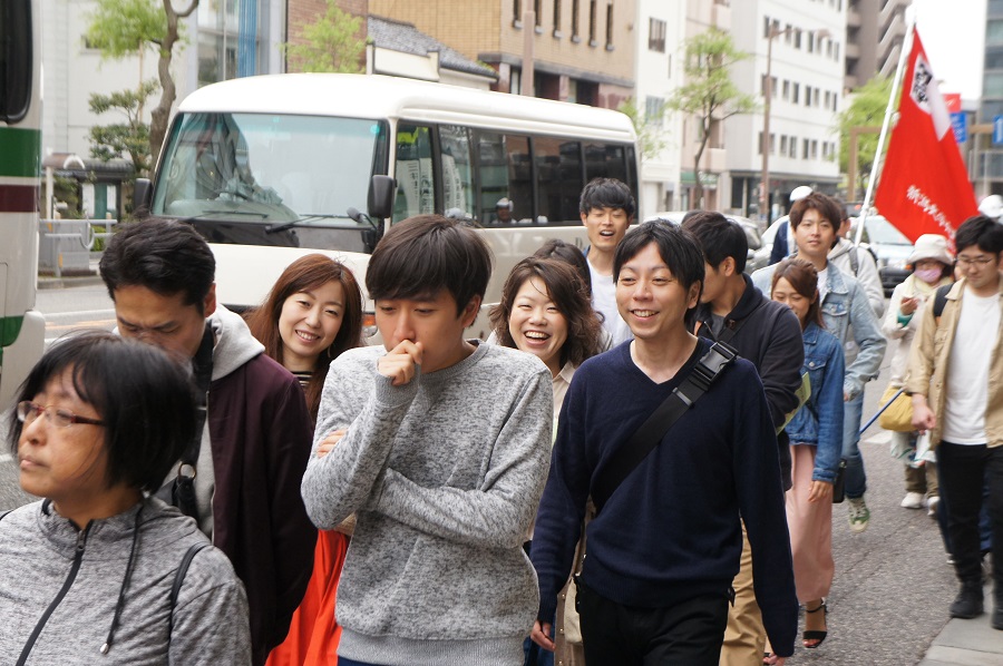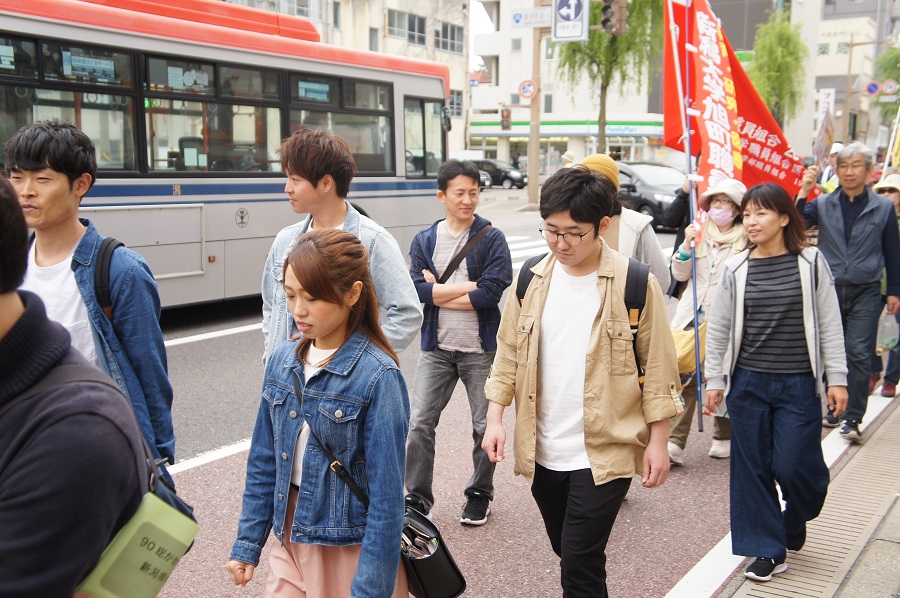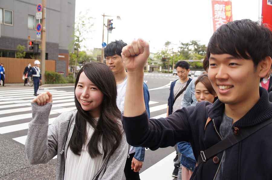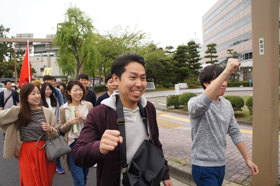 県民会館にて決起集会が行われ、その後デモ行進を行いました。(新潟県民会館→東中通り→柾谷小路→郵便局前まで)